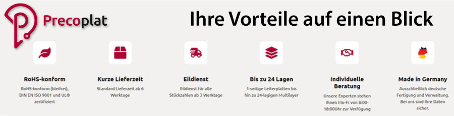 Darüber hinaus betreiben wir einen Online-Kalkulator / Webshop unter shop.precoplat.de, mit dem Standard-Leiterplatten bis zu einer Fläche von 1000 dm² direkt und schnell berechnet und bestellt werden können – auch ohne vorherige Registrierung.