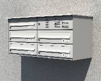 6 tlg. Briefkastenanlage Aufputz mit waagrechten Briefkasten Serie 08, enganliegende Verkleidung mit Schutzdach, Installationskasten, mit langem Dachüberstand für den Aussenbereich.